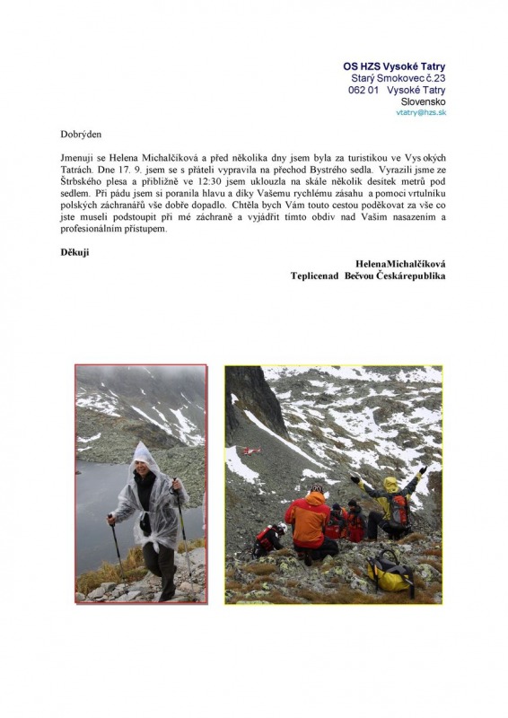 Na stránke HZS sú každý deň aktualizované výstrahy k podmienkam a počasiu na horách. Od posledného sneženia HZS stále nedoporučuje výstup na vysokohorské túry. Pre niektorých turistov sú výstrahy doslova lákadlom a vo väčšine prípadov končia pri tiesňových volaniach o pomoc. Možno aj dnešný výlet českých turistov bol následkom podcenenia podmienok na horách. Turisti schádzali z Bystrého sedla / 2314 m / do Frukotskej doliny. Pri schádzaní sa česká 42-ročná turistka pošmykla a poranila si vážne hlavu. O pomoc bol požiadaný vrtuľník VZZS, no pre zlé letové podmienky nemohol vzlietnuť. Medzitým vyrazili záchranári HZS, ktorí už predpokladali, že bez pomoci vrtuľníka sa môže záchranná akcia skončiť tragicky. Po príchode na miesto nehody pacientku ošetrili a boli pripravení na zostupovanie. Operačné stredisko HZS požiadalo ešte o pomoc poľských záchranárov. Keďže na poľskej strane bolo relatívne lepšie počasie, vrtuľník mohol vzlietnuť. Záchranná akcia našťastie dopadla rýchlejšie ako sa očakávalo. Poľský vrtuľník previezol pacientku na Štrbské Pleso, kde si ju prevzala RZP a odviezla na ďalšie ošetrenia do nemocnice v Poprade.