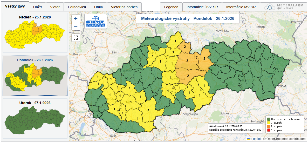 Slovenský hydrometeorologický ústav vydal meteorologickú výstrahu: trvanie javu od 25.1.2026 18:00 hod. do 26.1.2026 05:00hod..